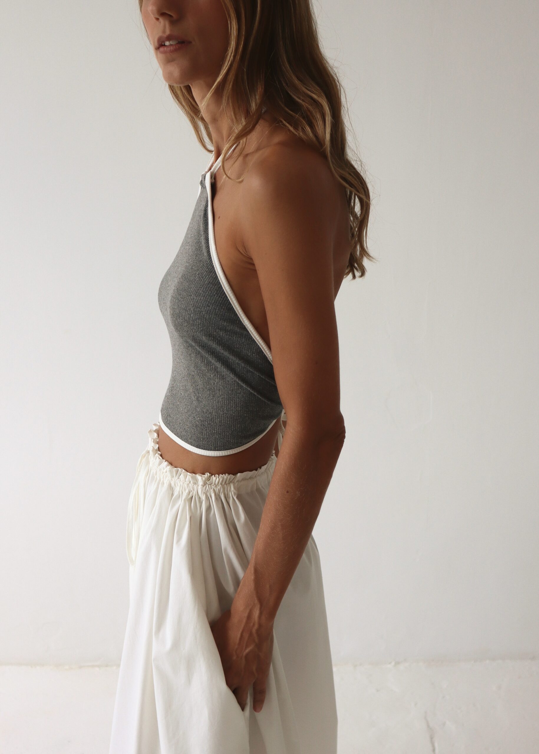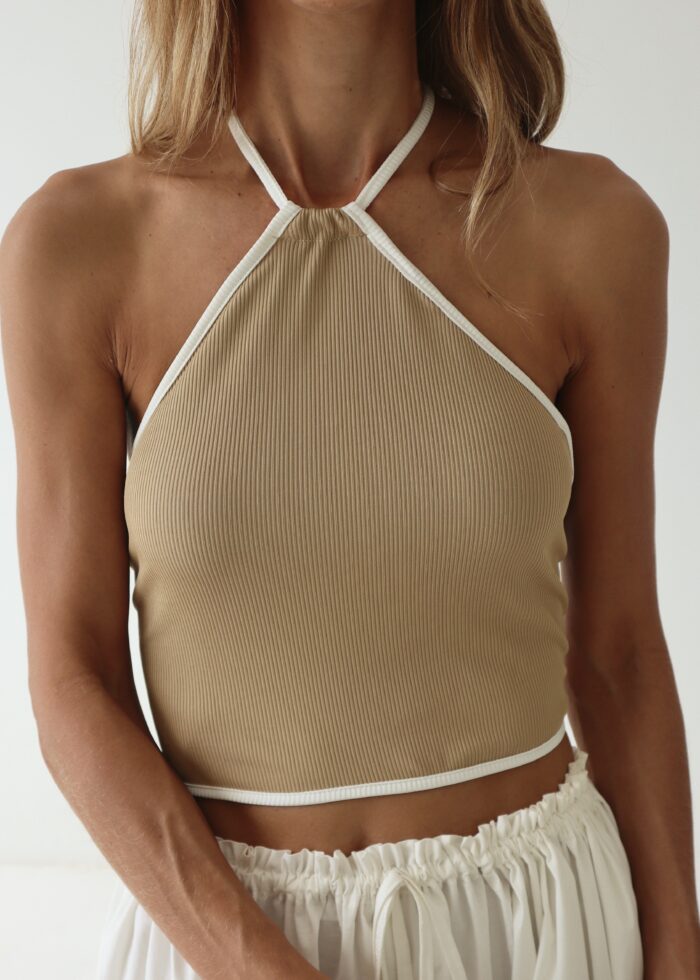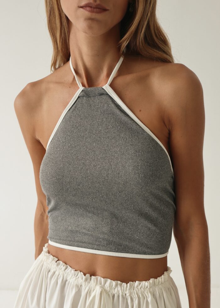 Top con escote al cuello y espalda descubierta con tiras para ajustar, esta elborado en rib acanalado y lleva bieses en contrastes de color.