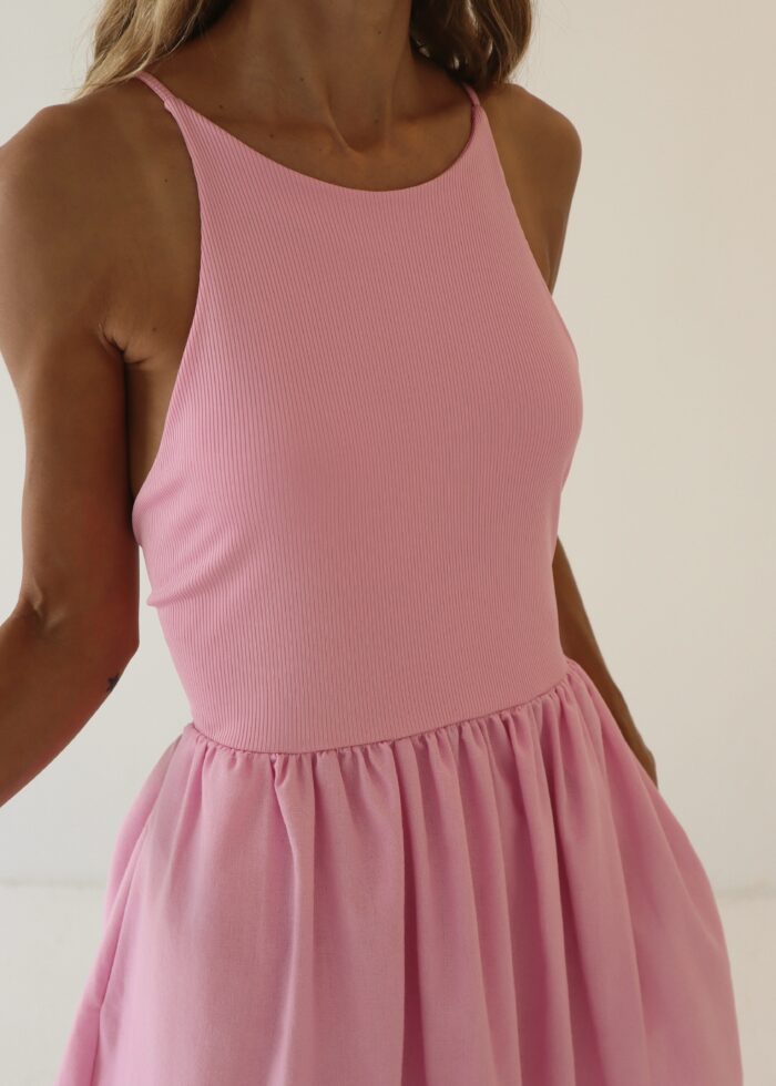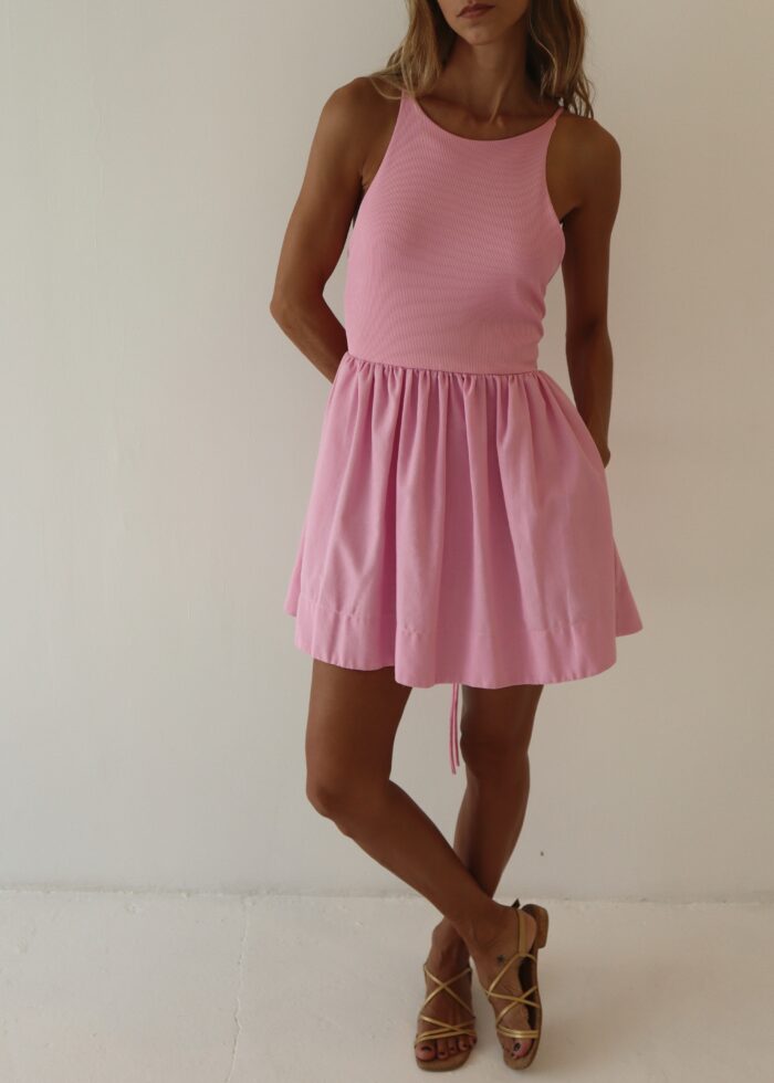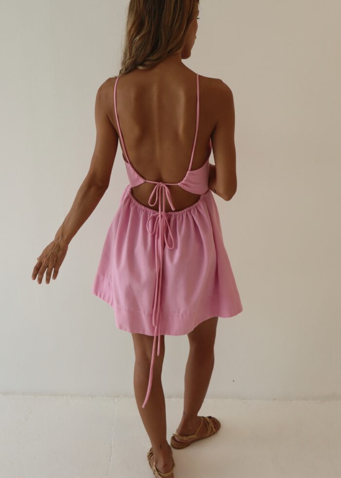 El vestido Lily se ha convertido en un clasico infaltable, esta vez viene en su version mini y su parte inferior es elaborada en lino. Lleva un escote en la espalda con tirantes ajustables y tunel en la cintura para graduar al cuerpo.