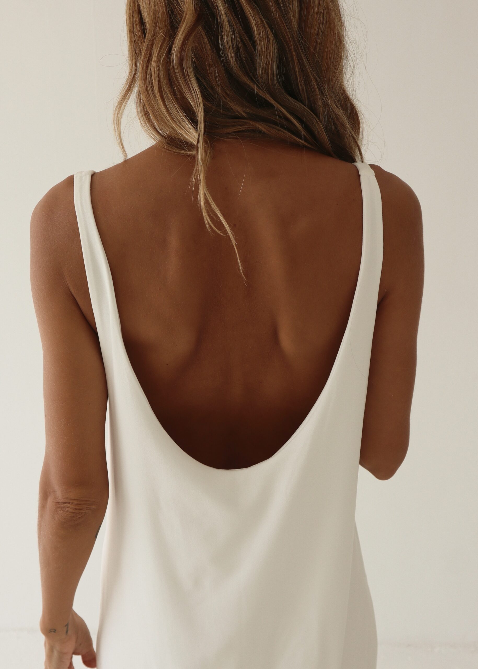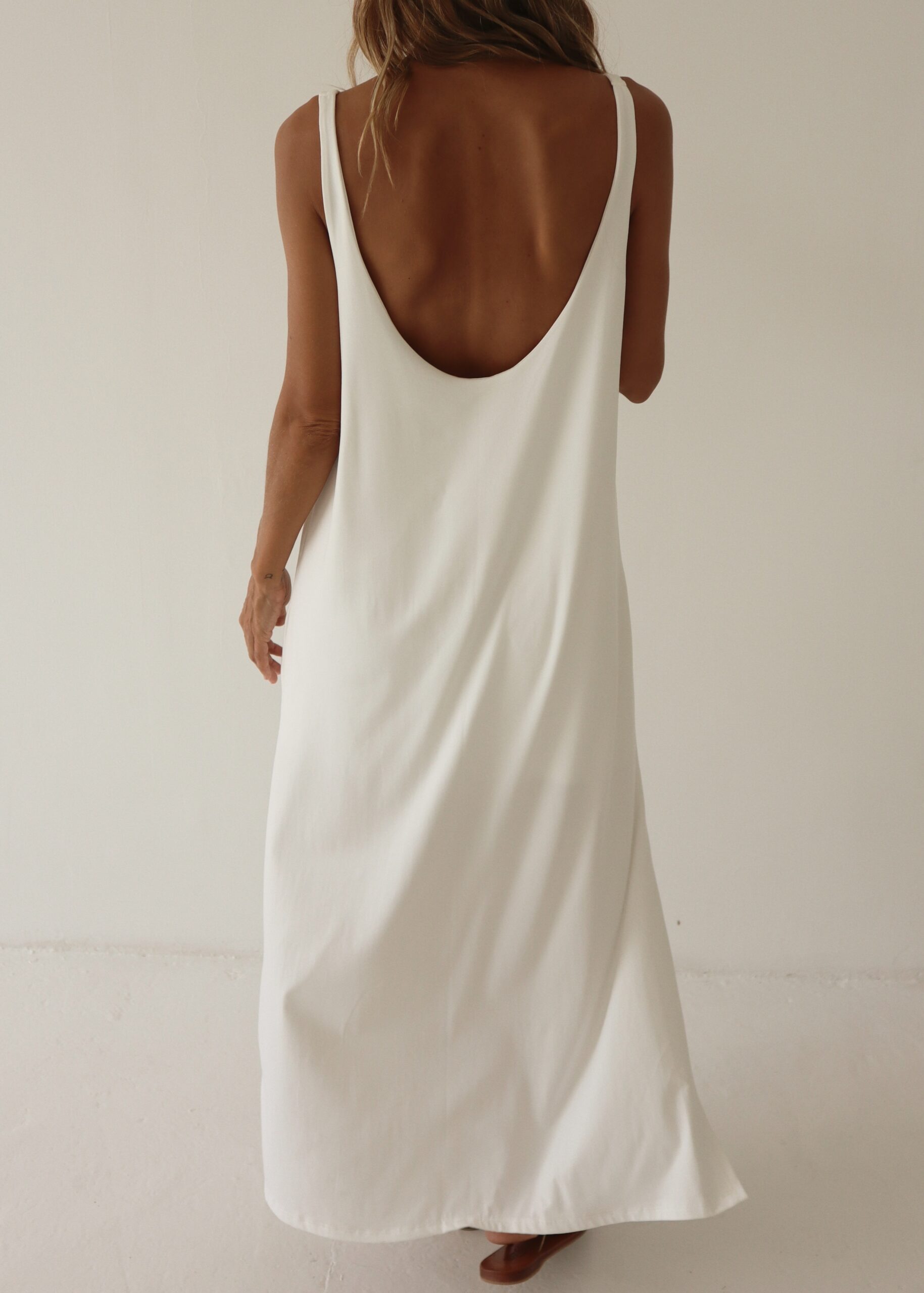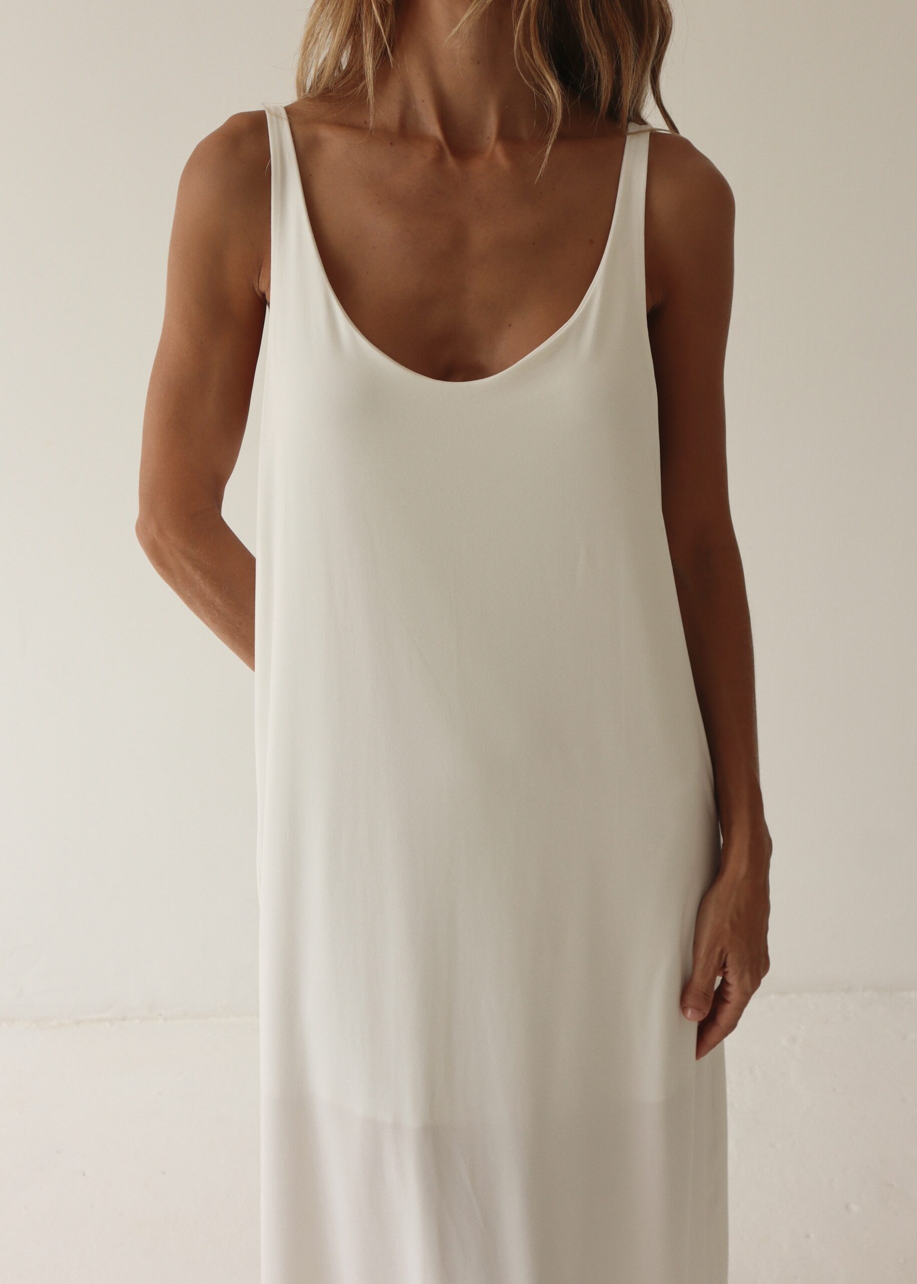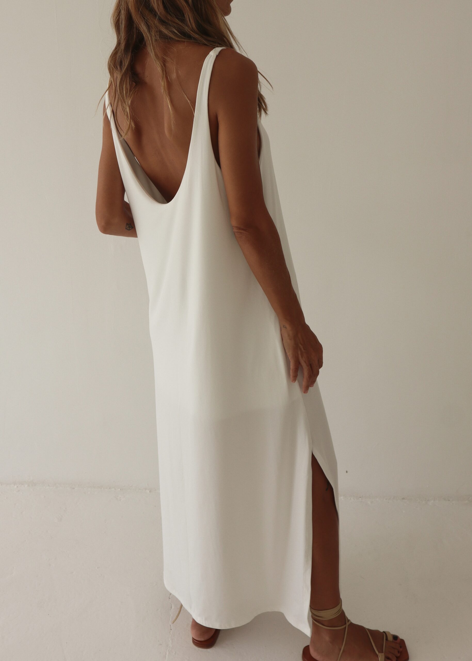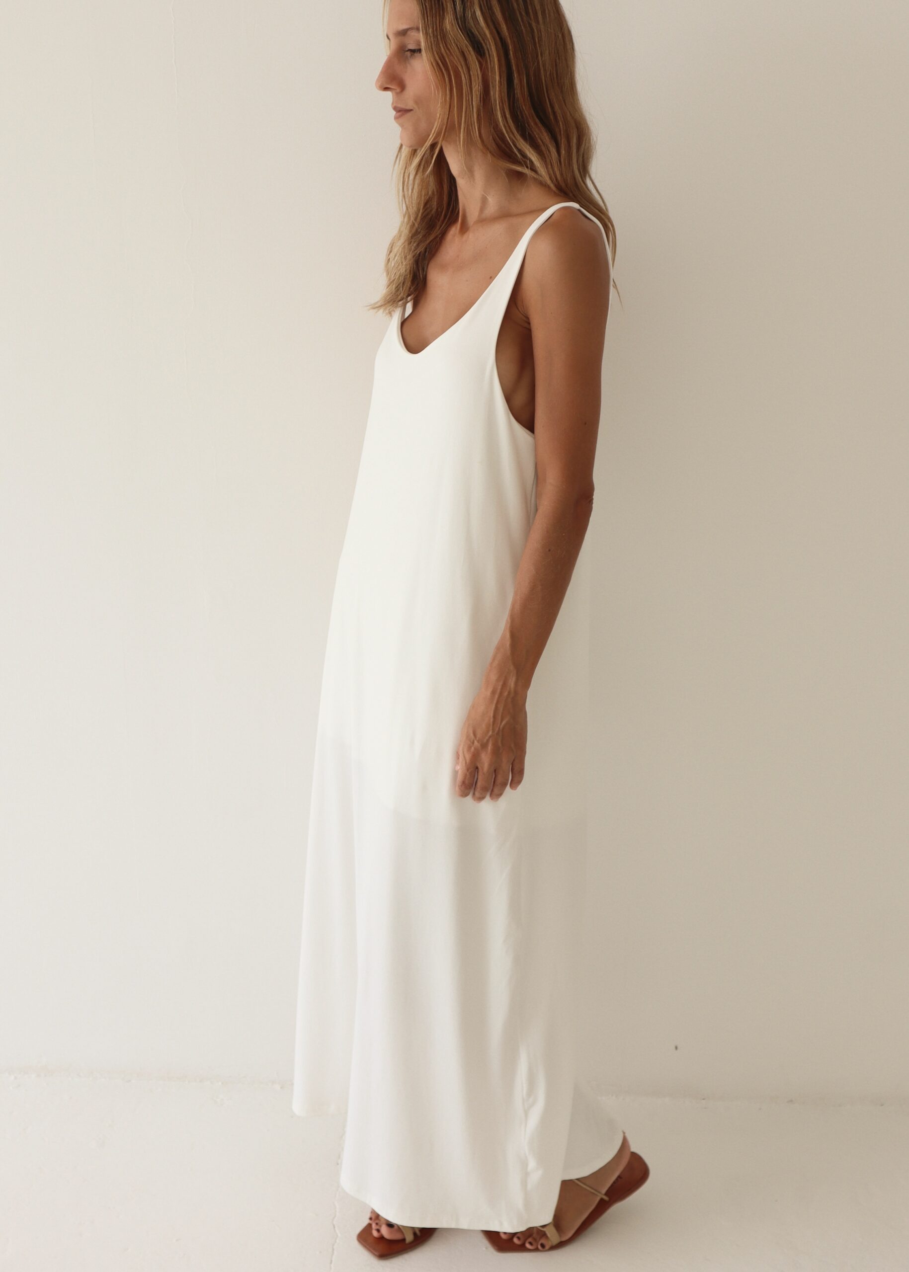 Vestido sin mangas con corte recto, forro interno y aberturas laterales. Elaborado en algodón viscosa.